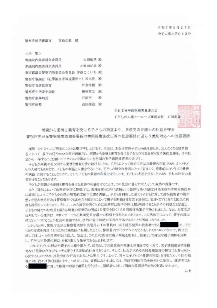 両親から愛情と養育を受ける子どもの利益より、共産党系弁護士の利益を守る警視庁光が丘警察署栗原和美署長の共同親権法改正等の社会要請に逆らう差別対応への改善要請