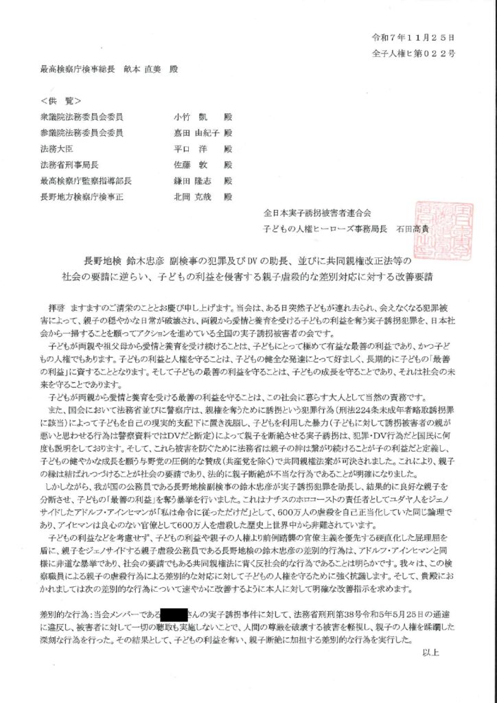 子どもの利益などを考慮せず、子どもの利益や親子の人権より前例踏襲の官僚主義を優先する硬直化した屁理屈を盾に、親子をジェノサイドする親子虐殺公務員である長野地検の鈴木忠彦の差別的行為は、アドルフ・アインヒマンと同様に非道な暴挙であり、社会の要請でもある共同親権法に背く反社会的な行為であることは明らかです。我々は、この検察職員による親子の虐殺行為による差別的な対応に対して子どもの人権を守るために強く抗議します。そして、貴殿におかれましては次の差別的な行為について速やかに改善するように本人に対して明確な改善指示を求めます。