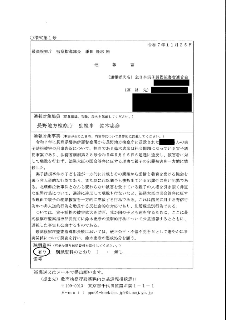 | 令和7年11月25日 最高検察庁 監察指導部長 鎌田 隆志 殿 通 報 書 (通報者氏名)全日本実子誘拐被害者連合会 代表 ○○○○○ (連 絡 先) |