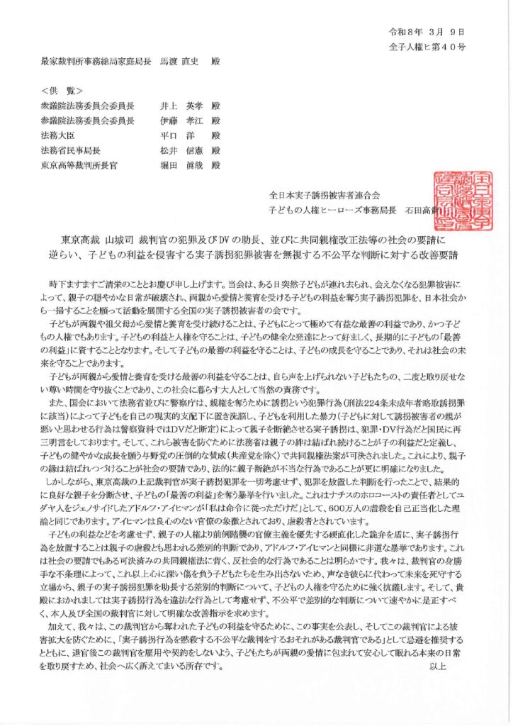 子どもの利益などを考慮せず、親子の人権より前例踏襲の官僚主義を優先する硬直化した詭弁を盾に、実子誘拐行為を放置することは親子の虐殺とも思われる差別的判断であり、アドルフ・アイヒマンと同様に非道な暴挙であります。これは社会の要請でもある可決済みの共同親権法に背く、反社会的な行為であることは明らかです。我々は、裁判官の身勝手な不条理によって、これ以上心に深い傷を負う子どもたちを生み出さないため、声なき彼らに代わって未来を死守する立場から、親子の実子誘拐犯罪を助長する差別的判断について、子どもの人権を守るために強く抗議します。そして、貴殿におかれましては実子誘拐行為を違法な行為として考慮せず、不公平で差別的な判断について速やかに是正すべく、本人及び全国の裁判官に対して明確な改善指示を求めます。